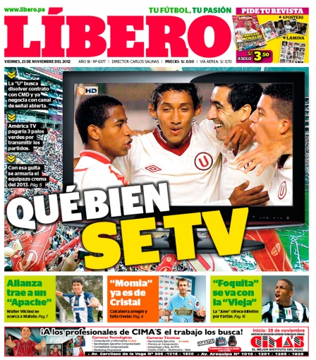 Los principales diarios deportivos del país informan en sus portadas de hoy viernes 23 de noviembre, sobre el supuesto interés de Universitario de Deportes por celebrar un contrato con el canal América Televisión para que transmita sus partidos en el Campeonato Descentralizado 2013.