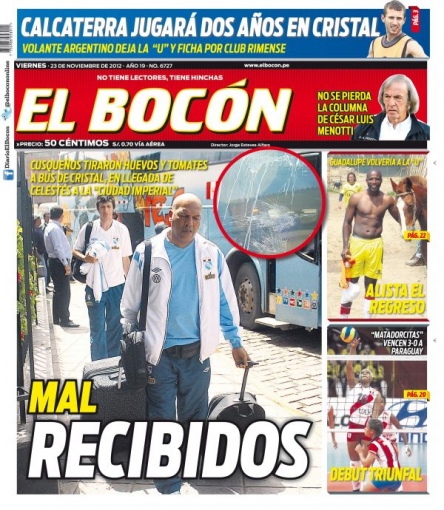 "Mal recibidos". El titular forma parte de la presentación de El Bocón, que se encarga del Play Off del balompié nacional. El equipo de Sporting Cristal fue atacado por huevos que lanzaron algunos sujetos en su llegada a la ciudad del Cusco, donde sostendrá una etapa de aclimatación para enfrentar al Real Garcilaso por el título del Descentralizado.