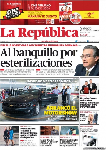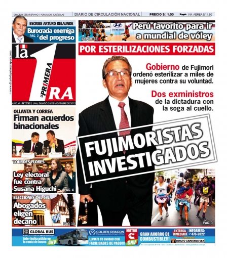 Entre los temas más destacados por la prensa escrita peruana para hoy sábado 24 de noviembre, está la reapertura de la investigación contra los exministros de Salud Alejandro Aguinaga y Marino Costa Bauer, por el presunto programa de esterilizaciones forzadas al que fueron sometidas aproximadamente mil quinientas mujeres durante la gestión presidencial de Alberto Fujimori.
