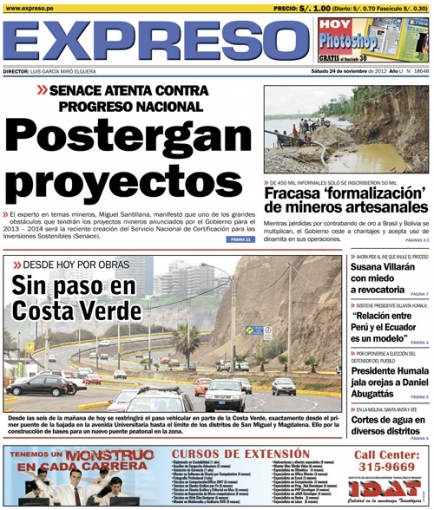 Ahora estamos con Expreso. Según el experto en temas mineros, Miguel Santillana, uno de los mayores problemas que tendrán los proyectos que el Gobierno anunció para el periodo 2013 – 2014 será la reciente creación del Servicio Nacional de Certificación para las Inversiones Sostenibles (Senace) y la aplicación de la Consulta Previa en comunidades.