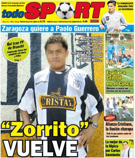 Los principales diarios deportivos del país informan en sus portadas de hoy sábado 24 de noviembre, sobre el posible regreso del delantero Wilmer Aguirre a Alianza Lima, el club que lo formó como jugador profesional.