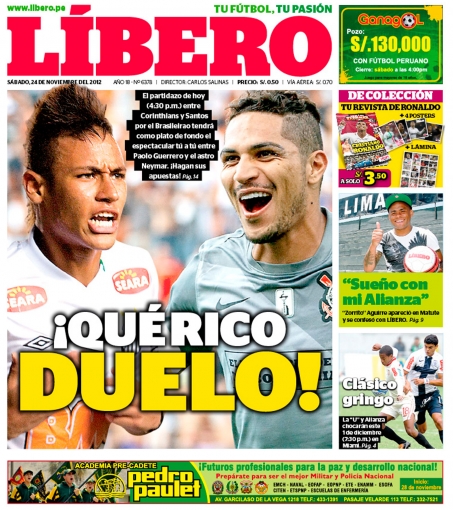 Por otra parte, Líbero se encarga del duelo de la fecha en la Liga Brasilera de Fútbol, que será protagonizado por el Santos de Neymar y el Corinthians del contundente Paolo Guerrero.