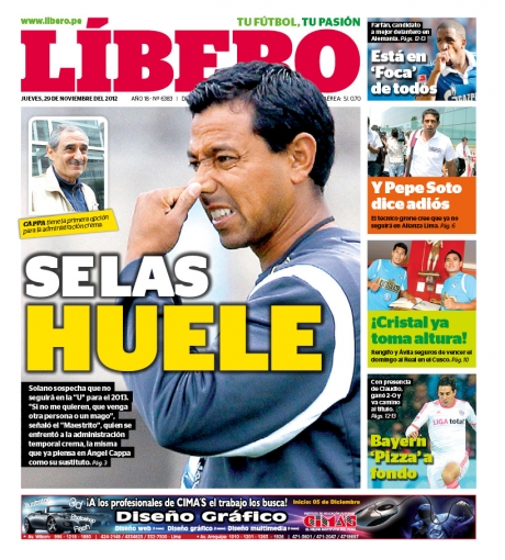 Por su parte, la gaceta Líbero se ocupa de lo que sucede al interior de Universitario de Deportes. El todavía preparador merengue Nolberto Solano tendría los días contados en ese cargo, debido a que su dirigencia le habría bajado el dedo por los malos resultados que obtuvo en la recta final del torneo local.