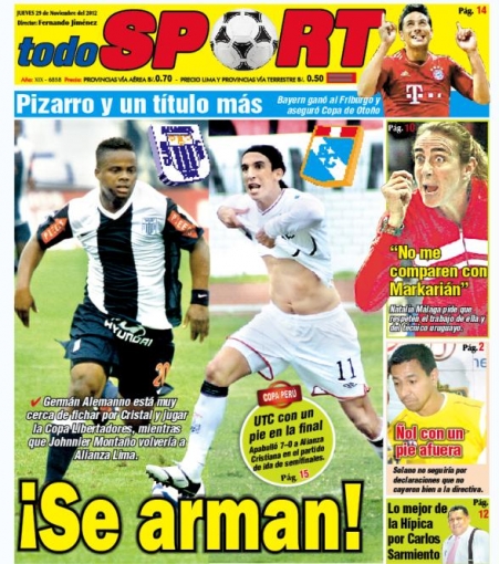 Los principales diarios deportivos del país informan en sus portadas de hoy jueves 29 de noviembre, sobre la posibilidad de que el volante Johnnier Montaño defienda una vez más las sedas de Alianza Lima para el Campeonato Descentralizado 2013.
