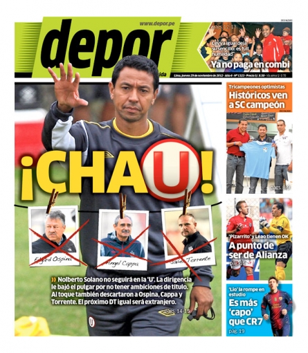 Cerramos este repaso con Depor, que al igual que este último habla de la posible salida de Solano del comando técnico de la "U", e incluso agrega los nombres del colombiano Edgar Ospina y el argentino Javier Torrente como sus posibles sustitutos.