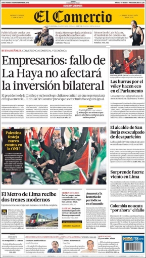 Finalizamos este repaso con El Comercio, que también hace hincapié al litigio marítimo que sostienen Perú y Chile. El titular de la Confederación Nacional de Instituciones Empresariales Privadas (Confiep), Humberto Speziani, aseguró que la primera no tendrá un impacto significativo en el flujo de las inversiones bilaterales.