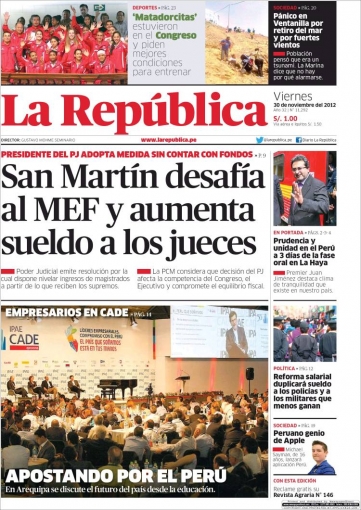 Por su parte, La República llega con todo lo concerniente al aparato legal en Perú. El Consejo Ejecutivo del Poder Ejecutivo, encabezado por César San Martín, ante todo pronóstico niveló los sueldos de los magistrados superiores, de primera instancia y paz letrado, de acuerdo a lo establecido en la Ley Orgánica del PJ desde 1991.