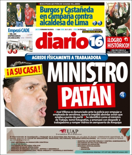 Entre los temas más destacados por la prensa escrita peruana para hoy viernes 30 de noviembre, se encuentra la supuesta agresión física que sufrió una empleada de la aerolínea LAN, por parte del titular del Ministerio de Trabajo, José Villena, en el aeropuerto internacional Rodríguez Ballón de la ciudad de Arequipa.
