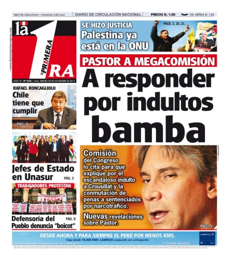 El ámbito internacional lo trae La Primera. La Asamblea General de Naciones Unidas concedió hoy a Palestina la condición de Estado Observador No Miembro y reafirmó el derecho de su pueblo a la libre determinación e independencia.