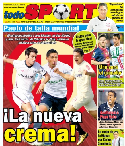 Bajo esa misma línea aparece Todo Sport. El delantero Gianfranco Labarthe, el volante Joel Sánchez y el mediapunta Juan José Barros están en la mira de Universitario para que suden su camiseta en la temporada 2013.