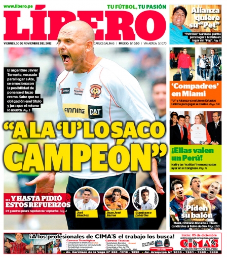 Los principales diarios deportivos del país informan en sus portadas de hoy viernes 30 de noviembre, sobre la posible llegada del argentino Javier Torrente a Perú para estar al mando de la dirección técnica de Universitario de Deportes, sucediendo así a Nolberto Solano.