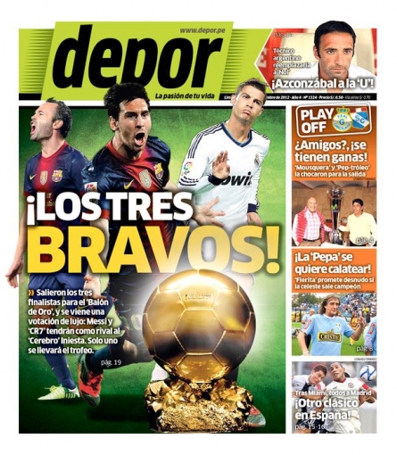 Finalizamos este repaso con Depor, que dedica su rostro a los candidatos al Balón de Oro: Lionel Messi, Andrés Iniesta y Cristiano Ronaldo.