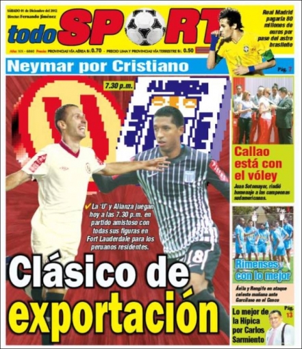 De otro lado, Todo Sport también hace hincapié al clásico del balompié peruano, al igual que el primer cotejo por la final del torneo local entre Real Garcilaso y Sporting Cristal, a jugarse mañana en la ciudad de Cusco.
