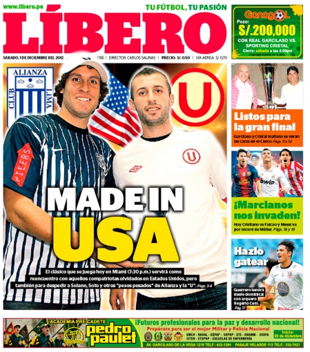 Los principales diarios deportivos del país informan en sus portadas de hoy sábado 1 de diciembre, sobre el partido que protagonizarán Universitario de Deportes y Alianza Lima en la ciudad estadounidense de Miami.