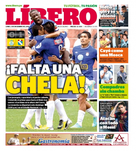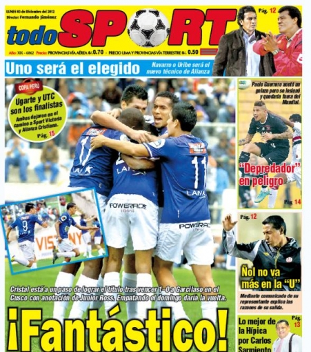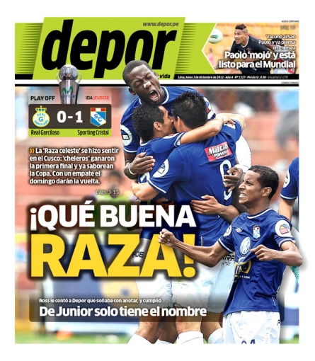 Los principales diarios deportivos del país informan en sus portadas de hoy lunes 3 de diciembre, sobre la victoria de Sporting Cristal por 1 gol a 0 sobre Real Garcilaso en la ciudad del Cusco, en la primera final por el título del Campeonato Descentralizado.