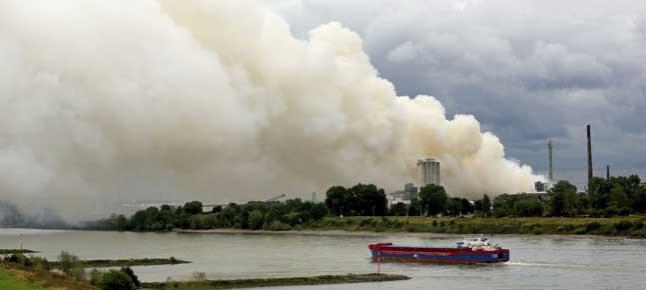El recipiente lleno de plaguicidas se incendió después de una reacción química entre su contenido y explotó. Mientras las llamas se apagaron, el humo amarillo se elevó cubriendo el cielo de la ciudad.