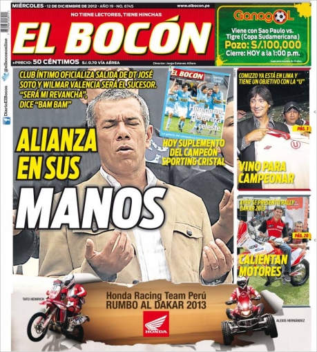 Los principales diarios deportivos del país informan en sus portadas de hoy miércoles 12 de diciembre, sobre la probable llega de Wilmer Valencia a Alianza Lima, para que dirija al primer equipo en el Torneo Descentralizado 2013.
