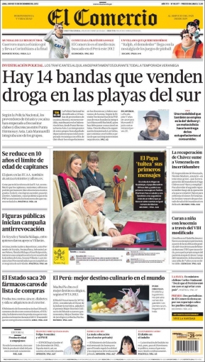 Cerramos este repaso con El Comercio, que presenta un informe respecto a 14 bandas que supuestamente se encargan de vender drogas en las playas del sur de Lima, sobre todo cocaína y éxtasis; mientras que La Primera cede importancia a la campaña en contra de la revocatoria de Susana Villarán.