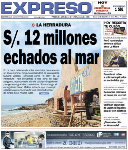 “12 millones de soles echados al mar”. Este titular es exhibido por Expreso y se refiere a los trabajos municipales en la playa La Herradura. El regidor de la Municipalidad Metropolitana de Lima, Alberto Valenzuela, acusó a la gestión de Susana Villarán de “haber echado agua” a los 12 millones de nuevos soles que invirtieron para la remodelación del malecón del conocido balneario.