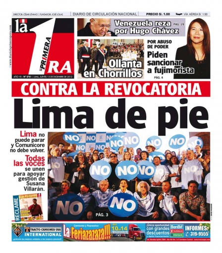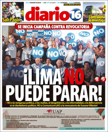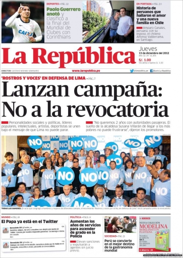 Entre los temas más destacados por la prensa escrita peruana para hoy jueves 13 de diciembre, se encuentra la creación del colectivo “Rostro y voces por el no, en defensa Lima”, el cual lanzó una campaña en contra de la revocatoria de la burgomaestre de la capital peruana, Susana Villarán.