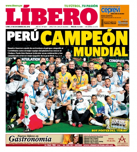 Los principales diarios deportivos del país informan en sus portadas de hoy lunes 17 de diciembre, sobre la destacada participación del delantero peruano Paolo Guerrero, quien marcó la diana con el que Corinthians superó 1 a 0 al Chelsea para proclamarse campeón del Mundial de Clubes 2012.