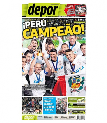 La misma temática es mostrada en Depor, que pone en gigante la figura del goleador peruano junto a la Copa del Mundial de Clubes ganada.