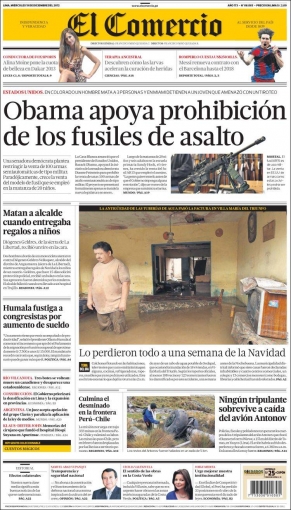 Finalizamos este recorrido con El Comercio, que dedica su rostro al apoyo del presidente de Estados Unidos, Barack Obama, al proyecto de ley en su país que prohíbe la compra de los fusiles de asalto, tras el asesinato a tiros de 20 niños en una escuela de nivel primaria en el estado de Connecticut.