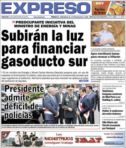 Entre los temas más destacados por la prensa escrita peruana para hoy miércoles 19 de diciembre, está la probable alza de los precios en los recibos de la luz por parte del Ministerio de Energía y Minas (MEM), con la finalidad de obtener recursos para solventar la construcción del nuevo Gasoducto Peruano del Sur (GPS).