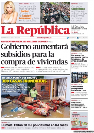 De otro lado, La República dedica su primera hoja a lo que acontece en Lima. En el distrito de Villa María del Triunfo, las viviendas de 300 familias terminaron inundadas por la ruptura de una tubería en la cuadra 27 de la avenida Pachacútec, provocando un gran malestar y ácidas críticas para la municipalidad del lugar y sobre todo Sedapal.