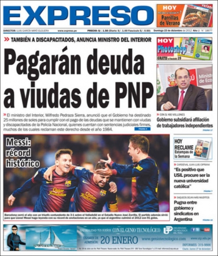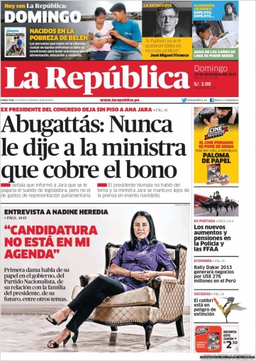 Entre los temas más destacados por la prensa escrita peruana para hoy domingo 23 de diciembre, están las apreciaciones de la Primera Dama, Nadine Heredia, respecto a las elecciones presidenciales del año 2016, luego de varios rumores que la ponen como una de las posibilidades de peso para reemplazar justamente a su esposo, el mandatario Ollanta Humala.