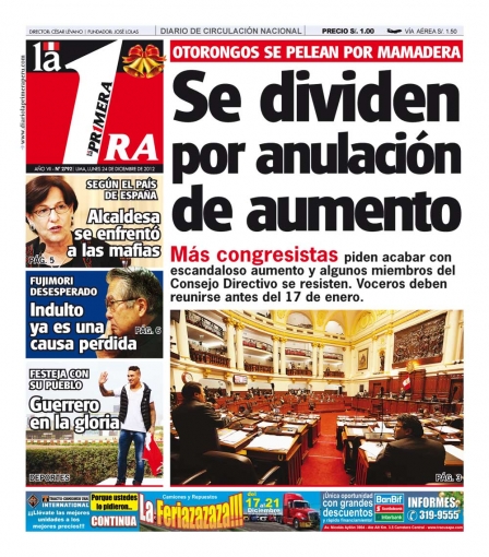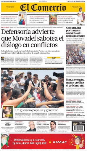 Finalizamos este recorrido con El Comercio, que exhibe un informe de la Defensoría del Pueblo, donde apunta a que el prosenderista Movadef se encuentra saboteando el diálogo en diversos conflictos sociales alrededor del país; mientras que La Primera se encarga del polémico y reciente aumento de sueldo de los congresistas.