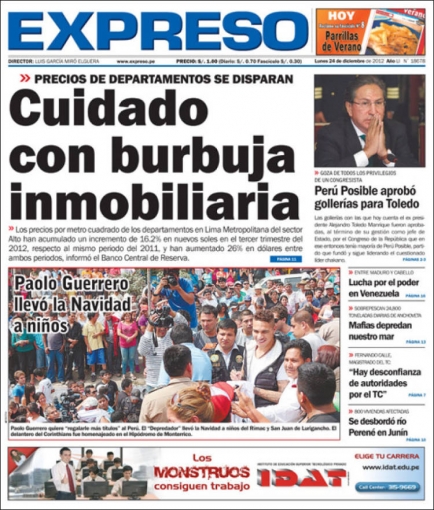 “Cuidado con burbuja inmobiliaria”. El titular, que pertenece a Expreso, hace referencia al reporte Indicadores del Mercado Inmobiliario del Banco Central de Reserva (BCR), donde se muestra que los precios por metro cuadrado de los departamentos en Lima Metropolitana del sector Alto, han crecido un 16.2% en nuevos soles en el tercer trimestre del 2012.