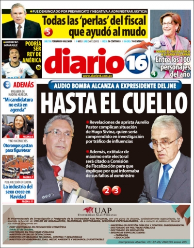Entre los temas más destacados por la prensa escrita peruana para hoy lunes 24 de diciembre, está la posibilidad de que el extitular del Jurado Nacional de Elecciones (JNE), Hugo Sivina, sea incluido en las pesquisas que viene realizando la Primera Fiscalía Provincial Anticorrupción sobre el exministro de Justicia, Aurelio Pastor, por el supuesto delito de tráfico de influencias.