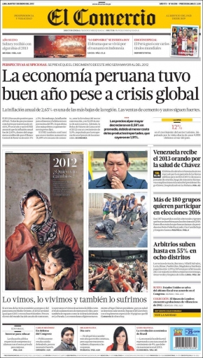 Entre los temas más destacados por la prensa escrita peruana para hoy martes 1 de enero de 2013, está el supuesto inicio de la etapa de transición en Venezuela tras conocerse la recaída que ha sufrido la salud del jefe de Estado, Hugo Chávez, quien se viene recuperando en Cuba de una intervención quirúrgica donde se le extirpó un nuevo tumor.