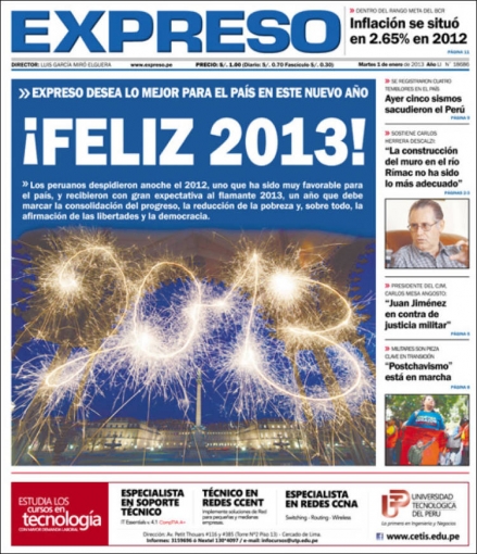 Cerramos el primer recorrido del 2013 con Expreso, que justamente le echa un vistazo a las diversas maneras en que los países recibieron el Nuevo Año, como Australia, Japón y Hong Kong por decir solo algunos; al igual que Perú 21.