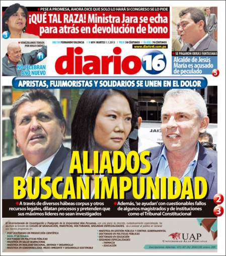Las temáticas relativas a Lima, por otro lado, vienen con Diario 16. El medio habla sobre un presunta pacto entre políticos representante del fujimorismo, aprismo y de la bancada Solidaridad Nacional, liderada por Luis Castañeda Lossio, con el aparente fin de apoyar la campaña de revocatoria contra la alcaldesa de Lima, Susana Villarán.