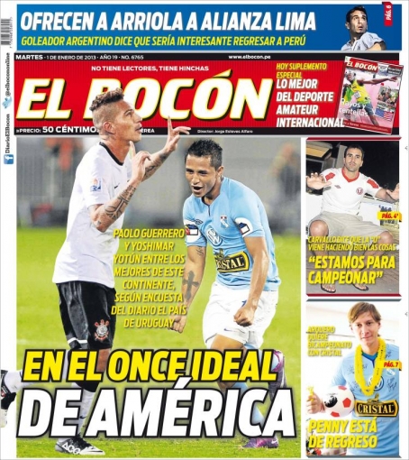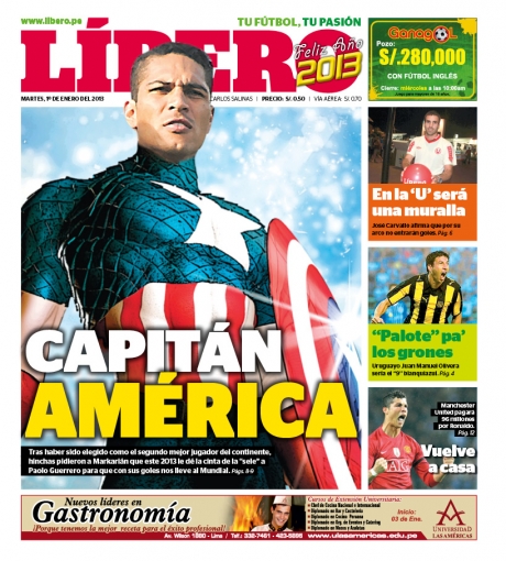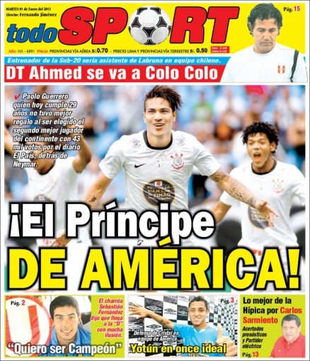 Los principales diarios deportivos del país informan en sus portadas de hoy martes 1 de enero, sobre el nombramiento del delantero peruano, Paolo Guerrero, como el segundo mejor futbolista de América.
