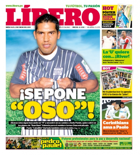 Los principales diarios deportivos del país informan en sus portadas de hoy miércoles 2 de enero, sobre el supuesto interés de Alianza Lima por los servicios del delantero peruano Andy Pando, uno de los goleadores del Campeonato Descentralizado 2012.