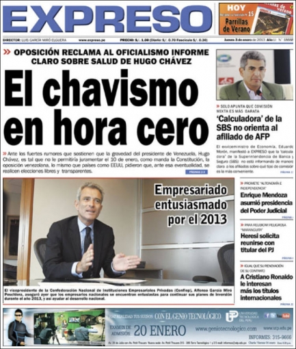 De otro lado, Expreso ofrece lo que ocurre en Venezuela. El secretario ejecutivo de la opositora Mesa de la Unidad Democrática (MUD), Ramón Guillermo Aveledo, exhortó al Gobierno que momentáneamente preside el vicepresidente Nicolás Maduro a “decir la verdad” sobre el estado de salud del mandatario Hugo Chávez, quien se encuentra en Cuba recuperándose de una intervención quirúrgica.