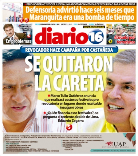 Por su parte, Diario 16 presenta todo lo que sucede en Lima desde un ángulo político. Marco Tulio Gutiérrez, uno de los promotores de la campaña de revocatoria contra la alcaldesa de la ciudad, Susana Villarán, anunció que comenzará a realizar festivales a favor de su causa en los lugares donde el exburgomaestre capitalino, Luis Castañeda Lossio, dejó programadas una serie de obras que “su sucesora no ha ejecutado”.