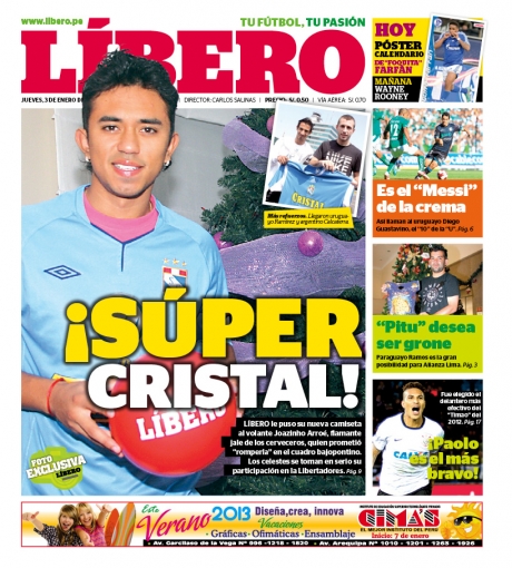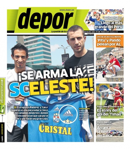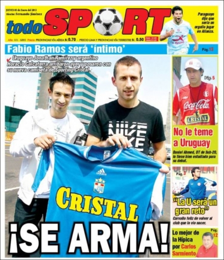 Los principales diarios deportivos del país informan en sus portadas de hoy jueves 3 de enero, de la reciente incorporación del volante Horacio Calcaterra a las filas del campeón peruano, Sporting Cristal.