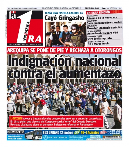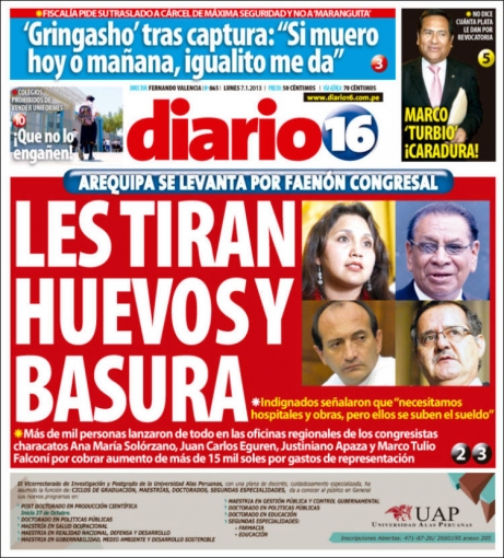 Finalizamos este repaso con Diario 16, que cede interés a las manifestaciones que se registraron en el departamento de Arequipa, contra el aumento de 7 mil a 15 mil nuevos soles en gastos de representación para cada congresista, por lo que lanzaron huevos a las oficinas parlamentarias de Ana María Solórzano, Juan Carlos Eguren, Justiniano Apaza y Marco Tulio Falconí, representantes de la ciudad en el Parlamento; al igual que el vespertino La Primera.