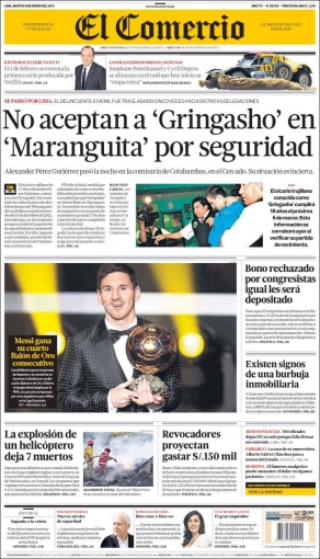 Al respecto, La República dedica su primera hoja a la opinión del presidente de la República. Ollanta Humala. La autoridad pidió la revisión de la leyes que permiten la ocultación del rostro del sicario Alexander Manuel Pérez Gutiérrez alias “Gringasho”, quien apenas tiene 17 años de edad, según su abogado.