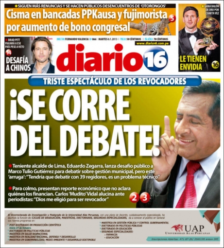 “Se corre del debate”. El titular es lanzado por Diario 16 y hace referencia a la campaña de revocatoria emprendida contra la alcaldesa de Lima, Susana Villarán. Uno de los promotores de esta idea, Marco Tulio Gutiérrez, buscó excusas para evadir el reto que le propuso el teniente alcalde de la ciudad, Eduardo Zegarra, quien desea un intercambio de críticas respecto a la actual gestión edil.