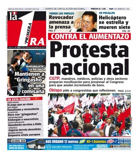 Cerramos este recorrido con La Primera, que cede interés a las diversas movilizaciones a nivel nacional que se vienen presentado contra el aumento de bonos de representación por parte de los congresistas.