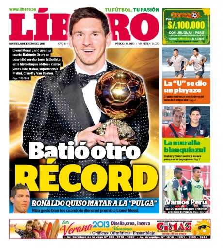 Los principales diarios deportivos del país informan en sus portadas de hoy martes 8 de enero, sobre la obtención del Balón de Oro por parte del astro argentino Lionel Messi, por cuarta vez de forma consecutiva.