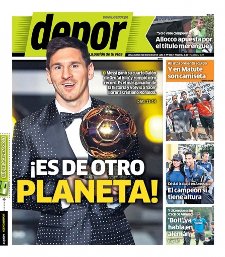Este logro es resaltado por Todo Sport. El mediapunta del FC Barcelona, Lionel Messi, vuelve a enorgullecer a la Argentina al ganar por cuarta vez el Balón de Oro de la FIFA, derrotando al portugués Cristiano Ronaldo del Real Madrid y al español Andrés Iniesta, con quien comparte camerinos.