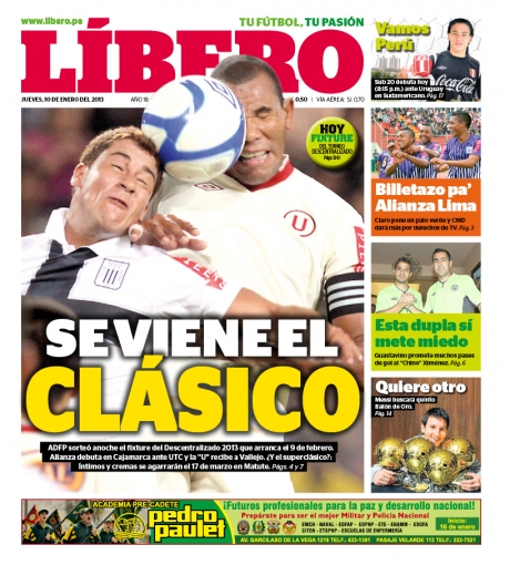 Los principales diarios deportivos del país informan en sus portadas de hoy jueves 10 de enero, sobre la programación del Torneo Descentralizado 2013 del fútbol peruano, teniendo como plato fuerte el tradicional choque entre los “compadres” Alianza Lima y Universitario de Deportes.