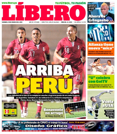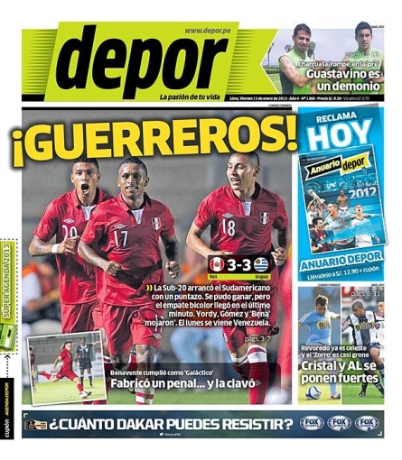 Los principales diarios deportivos del país informan en sus portadas de hoy viernes 11 de enero, sobre la paridad que cosechó la selección peruana de fútbol ante su similar de Uruguay, en cotejo válido por el Sudamericano Sub 20 que se celebra en Argentina.