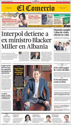 Entre los temas más importantes que presenta la prensa escrita peruana para hoy sábado 12 de enero, se encuentra la detención del exministro de Relaciones Exteriores durante el régimen fujimorista, Augusto Blacker Miller, quien se escondía en la ciudad de Tirana, capital de Albania, gracias a un operativo que emprendieron los agentes de la Interpol.
